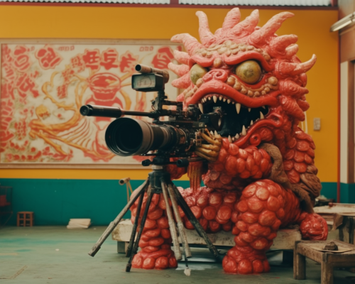 prompt a gigantic extremely angry red dim sum monster wielding rifle as shot on Panavision Panaflex Gold II, CAMÉRA FILM 35 MM, maximalism, --ar 5:4 --stylize 750 --v 5.1