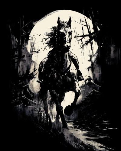 a cat sits on a horse, dark background, black and white illustration, horror movie atmosphere, spooky atmosphere, ink illustration, clear lineart --ar 4:5