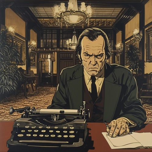 Jack Nicholson sitting in front of a typewriter at a desk. .a scene of The shining movie. , background is an empty spooky hotel. drawn by [Tetsuo Hara], animated by [Toei animation studio], 1985 Japanese anime --v 6.0