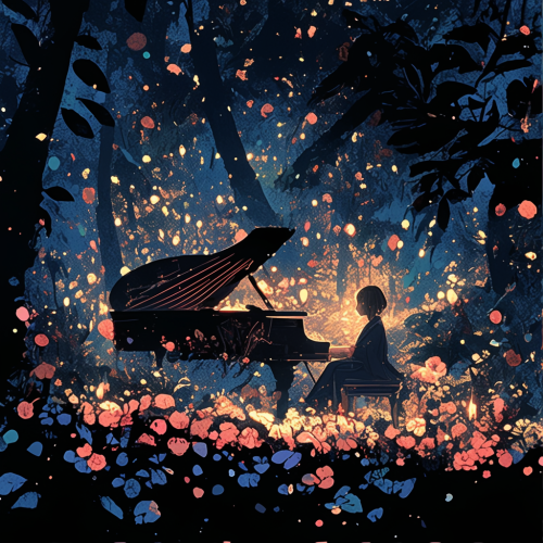 intricate digital illustration art painted in the style of matisses fashoion illustration,dreamy holy hevenly ethereal fantasy magic painting beautifullighting elegant sophisticated in the style of bold line,whole body,dark anime style,japanese manga style, horror movie poster with a piano and scattered rose in the dark forest midnight --niji 6 --s 750 --style raw