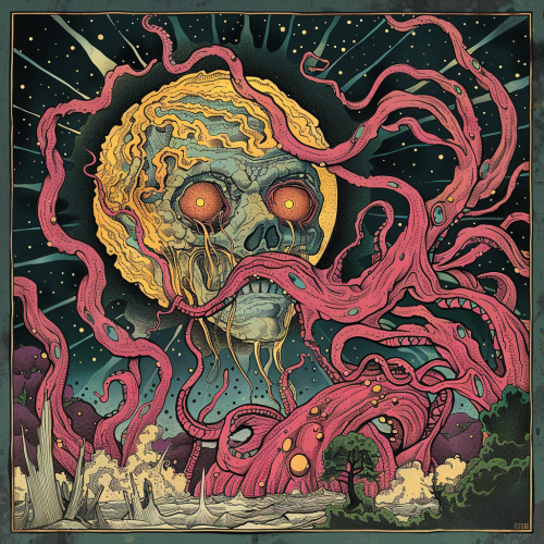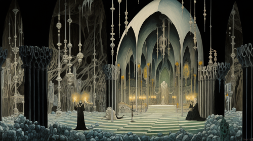fairytale illustration of the interior of a temple to a dark god during a ceremony, creepy, frightning, arcane, John Bauer, Kay Nielsen, Ivan Bilibin, --ar 16:9 --s 50