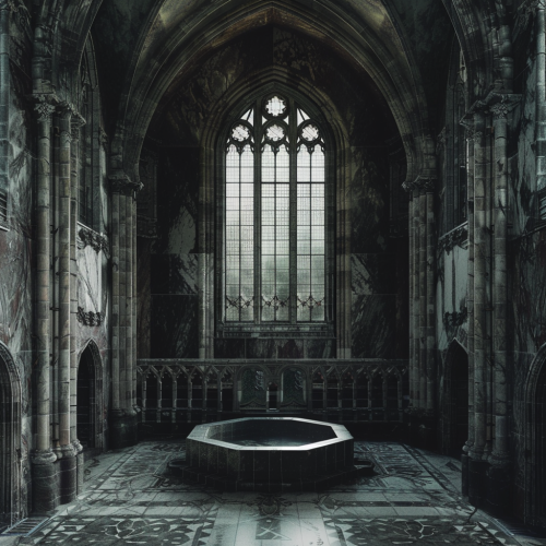 hyperrealistic photo of a cavernous, ornate, gothic-style room made of dark limestone and marble. It is a room meant for an occult secret society. There is a large window at the front of the room, hundreds of feet tall.