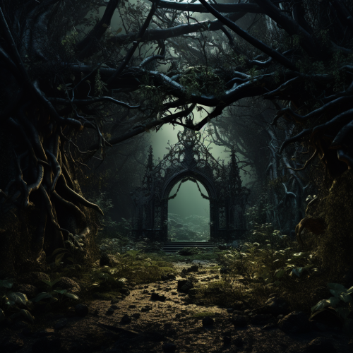 enchanted forest / dark colors / ornate patterns / eerie, foreboding, horror, macabre, nightmarish, surreal imagery / unsettling dark gothic artwork / haunting organic and biomechanic forms intertwined in complex and surreal ways / dreamlike and otherworldly atmosphere / menacing, mysterious aesthetic / exorbitantly detailed / 32K UHD resolution / cinematic lighting / cinematic shapes / cinematic effects / ray traced / game engine / high 3D octane rendering