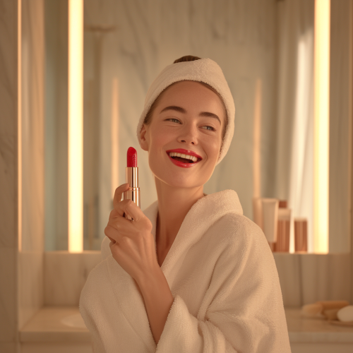 Luxurious bathroom scene with a woman holding a lipstick, symbolizing ELASTEN®, reflecting on her radiant, well-cared-for skin. She laughs a bit into the camera. 8k, ultra-realistic photo. --v 6.0 --ar 1:1