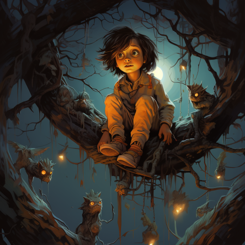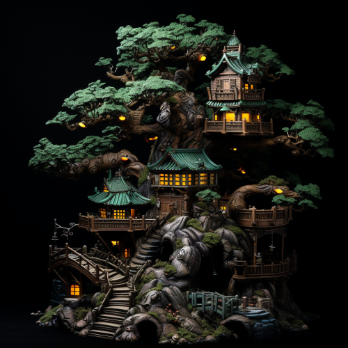bonsai tree as a treehouse, horror, black background, ominous, intricately detailed, anime style, Japanese animation, intricately detailed, photorealistic --v 5.2