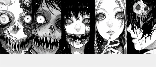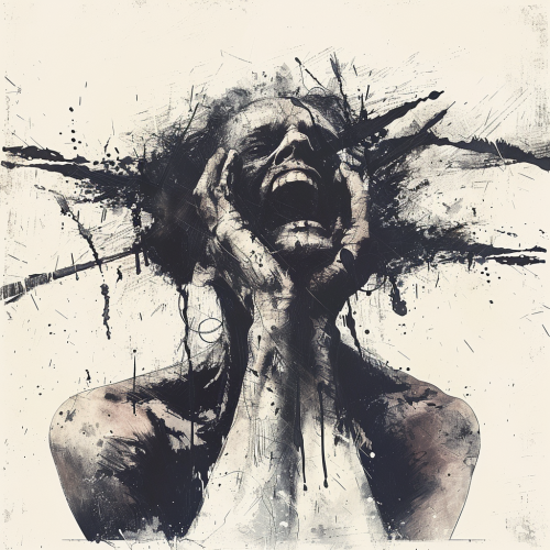 Creepy grotesque horror image of a man ripping his face off. Surreal, scratchy with minimal colour sketch. Black and red.
