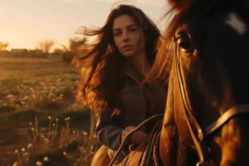 girl with ballayage and slightly curled har riding a black horse full-throttle. Her face is not visible as she turns her face away. The horse has a white stripe on the nose. shot on Agfa Vista 200, side-angle view, 4k cinematic warm colors in brown, gold, beige, orange setting --ar 3:2 --v 5.2