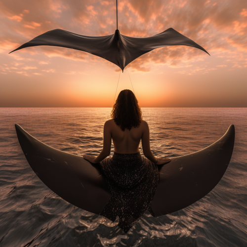 manta ray flying through the air, seen from the back, sunset background, woman sitting on the back of the manta ray