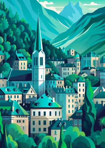 Grenoble flat illustration, not too complex, modern, 4k, epic composition, flat vector art illustration, turquoise & green, long shot --no text, fonts, letters, words, watermark --ar 5:7