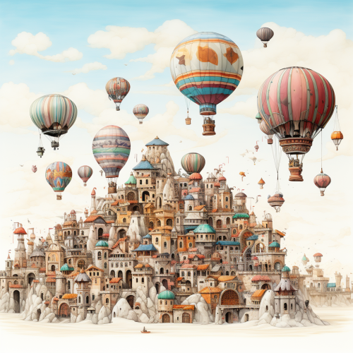 hot air balloon village, white background, pastel colors, style a mixture of Mad Max and Studio Ghibli