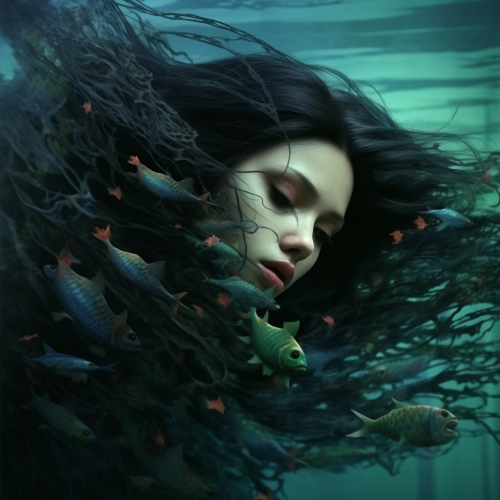 A fashion photo of man free - diver with a fish tail in a black oversize T - shirt in a swimming pool, Deep free - diving white modern swimming pool, medium plan , rays of light passing through the water, --ar 16:9 --v 6.0