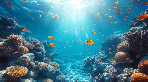 3d animation, a beautiful cartoon underwater, blue scene with fishes in center, in the style of three --ar 16:9 --s 750