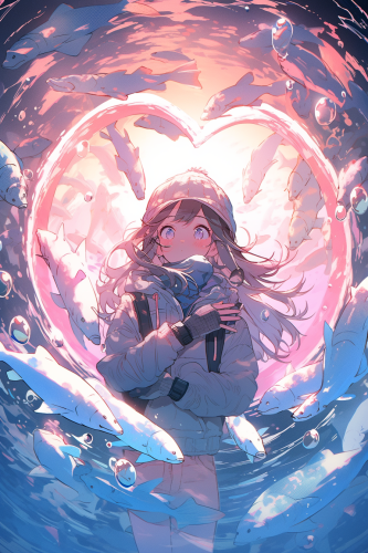 diver with school of fish circled in heart shape under pink water, bright tone, volumetric light, illustration style --ar 2:3 --s 750 --v 6.0