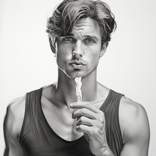 Hot guy eating popsicles, straight face, black and white pencil lines,,--ar 16:9,8k
