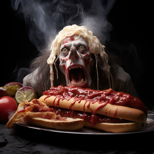 a photographic movie still of a grotesque hotdog creature salivating --v 5.2