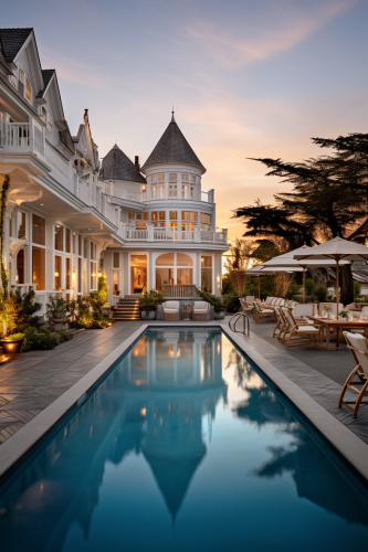 exterior architectural hi-res editorial award photo boutique hotel, very big and extensive outdoor pool area, white and gold color palette, victorian elegance, in Half Moon Bay, cedar walls, brass fixtures, hardwood floor, warm lighting, detailed, high resolution, photorrealistic, shot with a Sony Alpha a7R IV with 35mm f/2.8 GM lens --ar 2:3 --v 5.2 --style raw