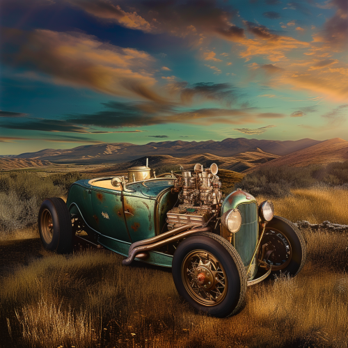 Hotrod, whimsical, Romanesque, brass copper blue, wrapped, solapunk, Pikes Peak, golden hour, studio light, photo --s 10