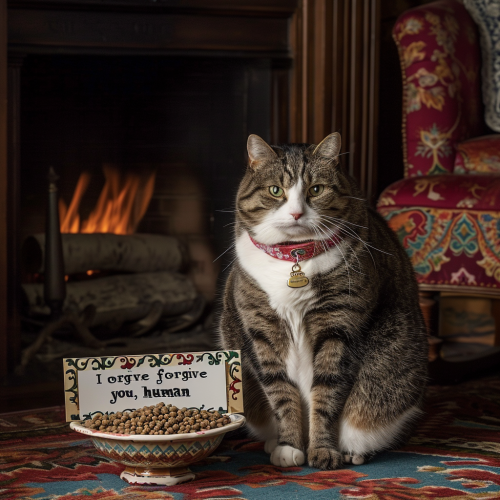 big fat heavy tabby cat sitting on a colorful plush expensive carpet near a fireplace, eating kibble from a large bowl decorated with luxury embellishments, white chest, grey black and beige stripes on the face, paws, and tail, holding a fancy poster that says: "I forgive you, human", professional photography --v 6.0