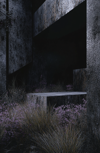 grass growing in foundation of building, modern arctiture, brutalism design, unreal 5.4, noir style, only these colors black violet charcoal thistle --ar 1048:123
