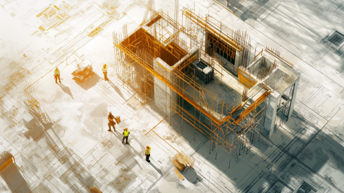 A visually engaging representation of a construction site, overlaid with architectural blueprints. The image shows workers assembling new homes according to detailed plans. This style combines technical drawing elements with real-life construction scenes, offering a professional look that would resonate with an audience familiar with home improvement and development. --ar 16:9