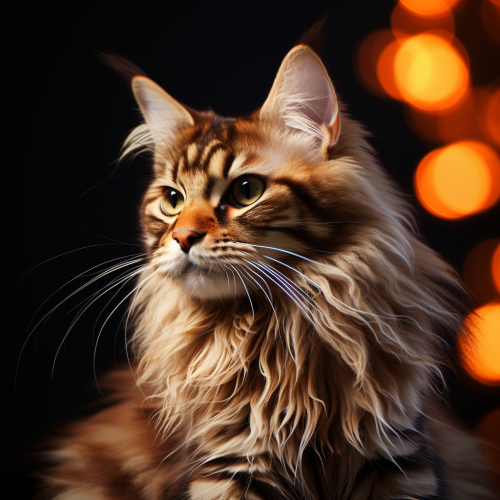 A fluffy brown and gray tabby cat with golden eyes lounging on the floor, looking at the camera, soft-focus background, close-up portrait photography, shallow depth of field, in the style of Canon EOS R5. --ar 128:85
