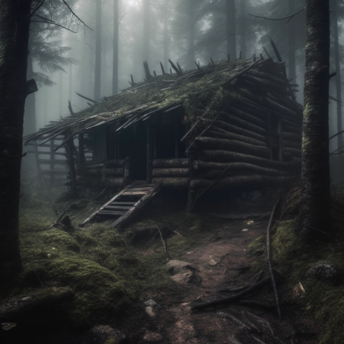 a ropeswing across a rocky gulley in the middle of the forest, it is dark, the air is thick with fog, a sense of unease and unseen danger pervades the entire scene, horror, HP lovecraft inspired --v 5.0 --s 250