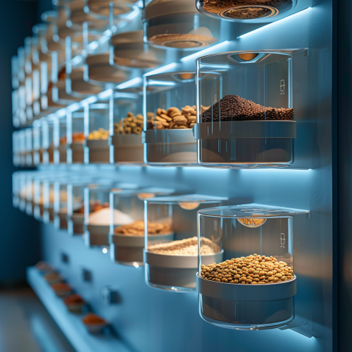 front view, A sleek, minimalistic interactive wall display blue background for a pet food factory tour. The wall includes transparent, modular scales and clear acrylic bowls representing nutrient categories: protein, fats, vitamins, and fiber, Subtle, soft LED indicators, professional and scientific design, with neutral accents, minimal guiding text, and a streamlined layout, precision, clarity, and elegance --v 6.0 --s 250