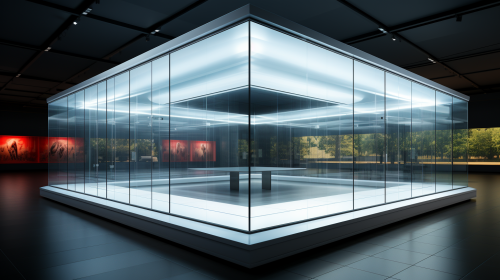 Photo realistic. An all white empty museum display room. A single glass display case showcasing mankinds singular greatest invention, --s 1000 --v 5.2 --c 10 --ar 16:9