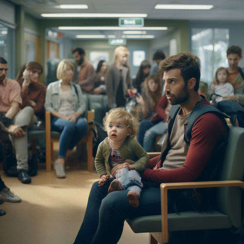 An totally overcrowded waitingroom at the Child Psychology Services, parents are holding crying babies, others are trying to console anxious toddlers or teenagers. mood childish and emotionally evocative, epic 300mm professional promotional commercial advertisement movieposter, 4k