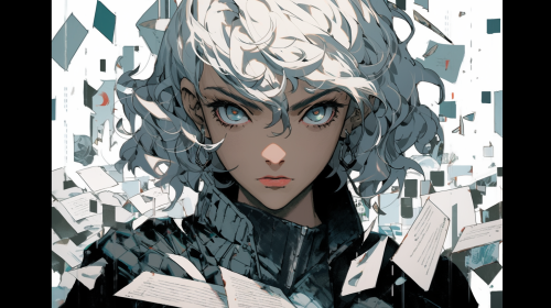 manga anime style, full body picture cyber punk gangster woman holding a confidential letter and smoking a cigarrete with big eyes looking rough like he has been partying too much, line drawing illustration in the style of katsuhiro ottomo and Frank Miller, cel shading high contrast, white background, low details, simple design, strong outline, Decorative coloring, glitched effect, sharp abstract butterfly logo background --ar 16:9 --stylize 1000 --niji 5