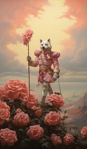 ciro marchetti ilustration of a clown walking in the top of a cliff with staff and roses next to a white dog red sky --ar 7:12