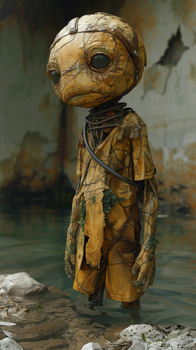 full body, human-shaped Japanese monster kappa, standing on the water's edge, the top of the head is bald, a little hair grows on the sides, turtle-like creature, the image is complex 3D Must be in style. detail. Images must be high resolution and clearly focused. 3D art, surreal, realism, --ar 9:16 --s 750 --v 6.0