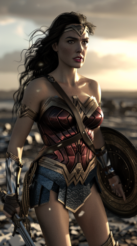 A photorealistic full-body Wonder Woman, unmasked, standing on a battlefield at sunrise. Her unmasked face shows fierce determination, with her iconic armor glistening in the early light. Her sword is drawn, and her shield is raised, with a destroyed battleground behind her. Realistic armor textures, dramatic lighting, hd quality, heroic stance --ar 9:16 --v 6.0 --s 50 --style raw