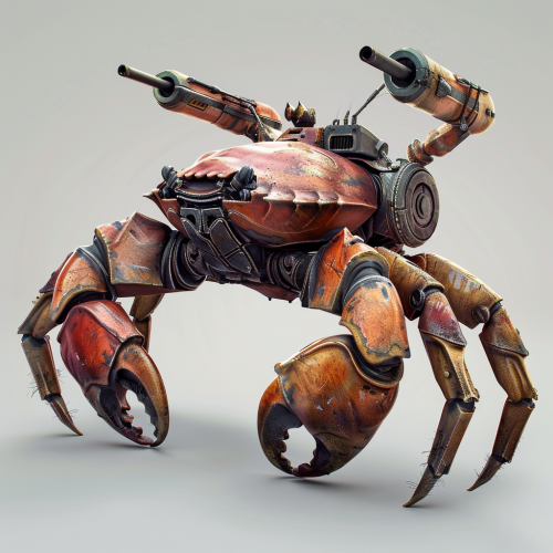 tank-like crab game character , with one of his claws as a shutgun