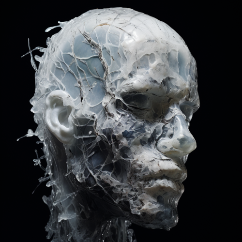 Cubist representation of a human head, using fragmented geometric forms and a muted color palette to convey dynamism and complexity. The layered texture and abstract composition create a sense of movement and intensity, reflecting a mood of disorientation and inner turmoil.