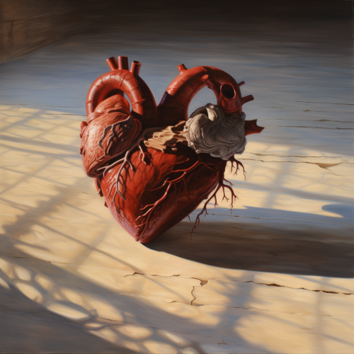 large area of blank background, minimalist product photography of an artificial human heart assembled of plastic and metal components, shades of black and pink --ar 2:3 --v 6.0