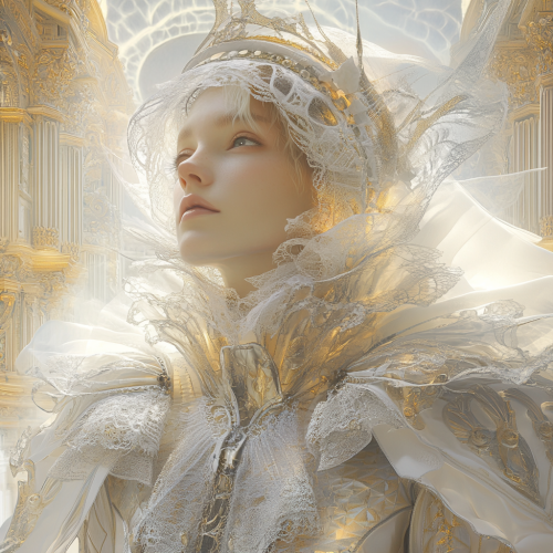 A masterpiece of unparalleled sophistication, blending elements of Renaissance artistry with futuristic surrealism. Hyper-detailed portrait of a regal figure with delicate features, clothed in intricate, Baroque-inspired attire woven with glowing, iridescent patterns. Background of a grand, atmospheric landscape merging ancient architecture and otherworldly technology. Ethereal light casting dramatic shadows, emphasizing textures and depth. Subtle touches of gold, silver, and translucent hues, resembling a fusion of oil painting and digital art techniques. Ultra-realistic, soft-focus, cinematic mood, conveying timeless elegance and profound mystery.