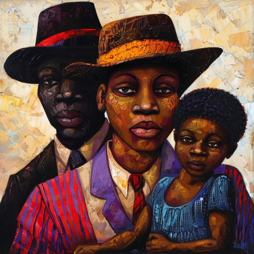 Harlem renaissance type painting of a black family. Solid colors
