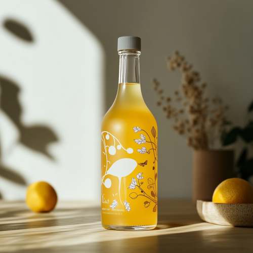 une bouteille en verre de cocktail sans alcool, avec un design premium de 33cl, avec un visuel sobre qualitatif et gourmand, avec un style qui vient du sud et provencal
