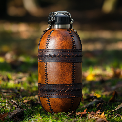 a high quality rugby ball shaped stainless steal bottle that is designed for rugby sports players and supporters to support their local rugby team through their rugby ball shaped drink bottle, the bottle has a leather outside and the inside is steal to keep the liquid cold, The outside is high quality leather, same colours as the warriors rugby league team. make the background a nice gradient colour to display the bottle, make the bottle be able to stand straight on its own, make the bottom section the bottle stands on a twist top where people can store powder or supplements, make the quality of the ball feel like a rugby ball, look like a rugby ball in the highest quality possible --s 250