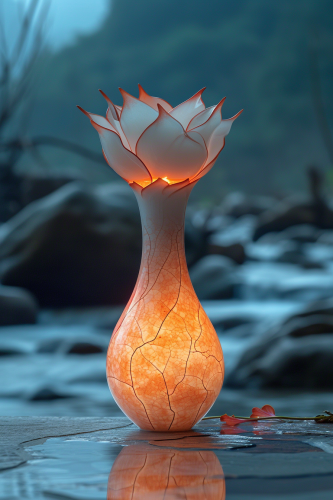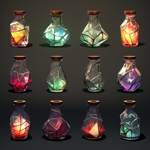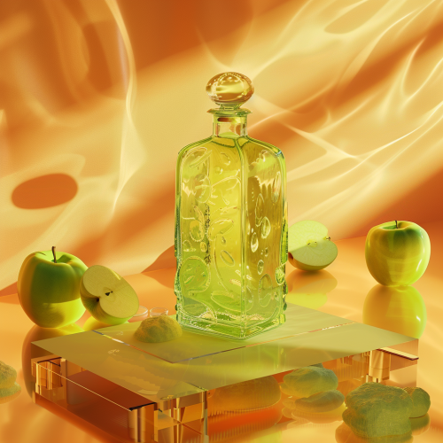 :Concept: 1920x1080, still life composition Subject: A single glass bottle in the center of the frame. Bottle Details: Soft green with subtle yellow highlights,highe contrast, reminiscent of aged glass. Glass texture with visible reflections and a soft shadow cast on the platform beneath, . Background: Soft orange with sun reflection, evoking a warm and inviting atmosphere. Additional Elements: Two queues of objects flowing from the foreground towards the bottle. Objects share the same soft green color as the bottle, but with a mix of plastic and Gloss textures floting. All objects in motion, creating a sense of dynamic energy around the still bottle. Additional Notes: Use a photorealistic style. Consider incorporating Art Deco influences in the design of the objects and overall composition. Experiment with different lighting angles to highlight the texture and form of the bottle. Example Prompt: A photorealistic 1920x1080 still life painting in the Art Deco style. A soft green glass bottle with aged texture rests on a platform in the center of the frame. The background is a soft orange. Two queues of objects, some with plastic and apple textures, flow from the foreground towards the bottle, all in motion. Focus on the bottle's texture and reflections, and explore different lighting angles for a dynamic composition