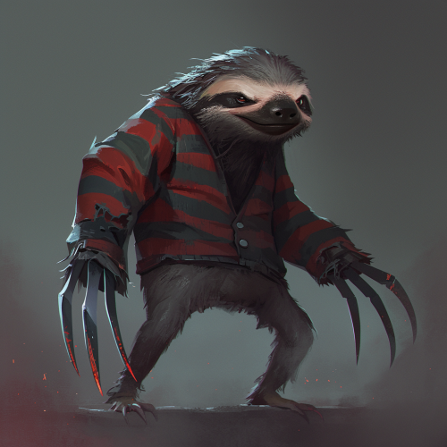 Create a terrifying sloth character named ‘Nightmare Slasher Sloth,’ inspired by Freddy Krueger. He has shadowy gray fur with hints of dark green, resembling moss, and long, razor-sharp claws that resemble Freddy’s iconic glove. Scary Sloth wears a tattered, striped sweater similar to Freddy Krueger’s, with dark, sinister colors. His eyes glow with a menacing red light, and his face has a twisted, sinister grin. The scene is set in a dreamlike, nightmarish landscape where reality bends and distorts, with fiery skies, cracked earth, and unsettling shadows. Scary Sloth’s presence is menacing, with his claws dragging through the environment, creating sparks and deep gouges as he moves. The atmosphere should be dark, gritty, and filled with a sense of terror, focusing on the slasher theme. --niji 6