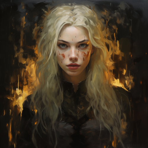 D&D Character Portrait, Anya Taylor Joy, Necromancer, Undead, Bright Golden Eyes, Nightmare Fuel, Anxiety, Terrifying, Tomb background, Oil Painting