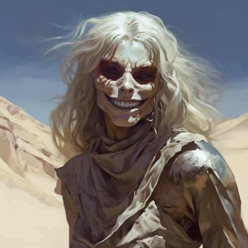 D&D Character Portrait, Human Female, Necromancer, Undead, Bright Golden Eyes, Nightmare Fuel, Anxiety, Terrifying, Manic Smile, Creepy, Desert background, Oil Painting