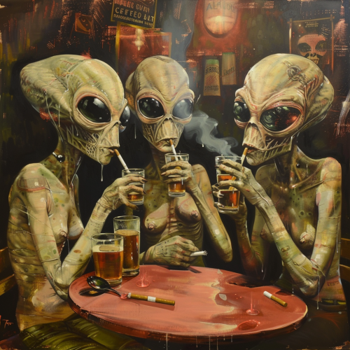 Aliens enjoying human alcholic drinks and smoking cigarettes