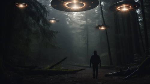A man getting abducted by aliens in the middle of the forest, close up, dark, UFO, aliens --ar 16:9