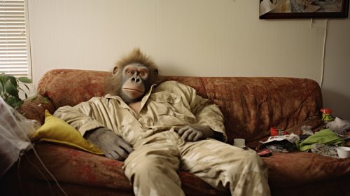Humanoid ape relaxing on cluttered couch