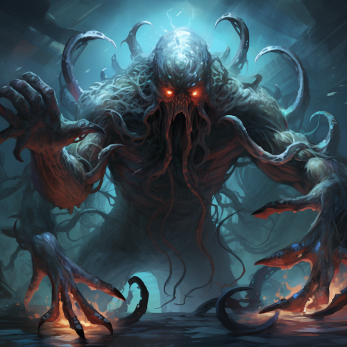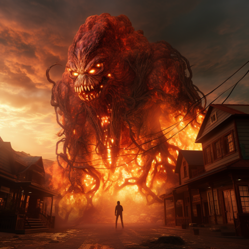 A town of terror made of a large hollow Fiery Burning amber that reaches to the sky, with a tall, terrifying monster intricate high resolution super detailed UltraHD, dynamic composition, CG render, unreal engine