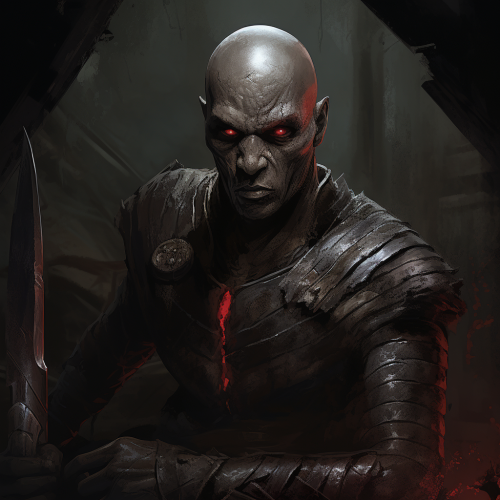 an humanoid with black skin bald, with a triangular unique red eye, mouth full of razor teeths, holding a blade made of bones