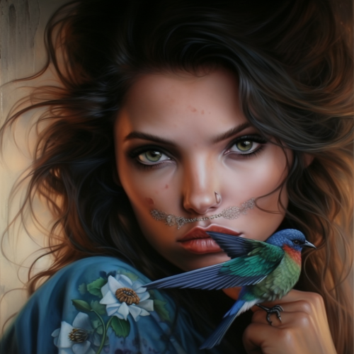 beautiful woman, soft dark curls, bright blue eyes, hummingbird-tattoo under her eye, realistic